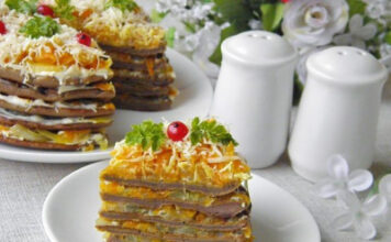 Пошаговая инструкция: 1. Приготовление коржей для печеночного торта 2. Обжарка лука и моркови 3. Приготовление домашнего чесночного майонеза для промазывания коржей 4. Сборка торта 5. Пропитка торта в течение часа 6. Украшение торта 7. Подача торта на стол
